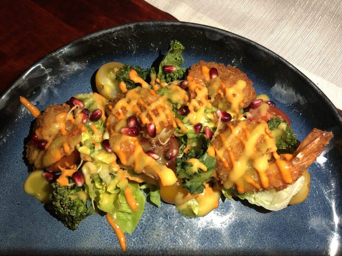 – Spoti salat paneeritud krevettidega – minirooma salat, tomat, kurk, lehtkapsas, paprika emulsioon, virsiku-chilli kaste