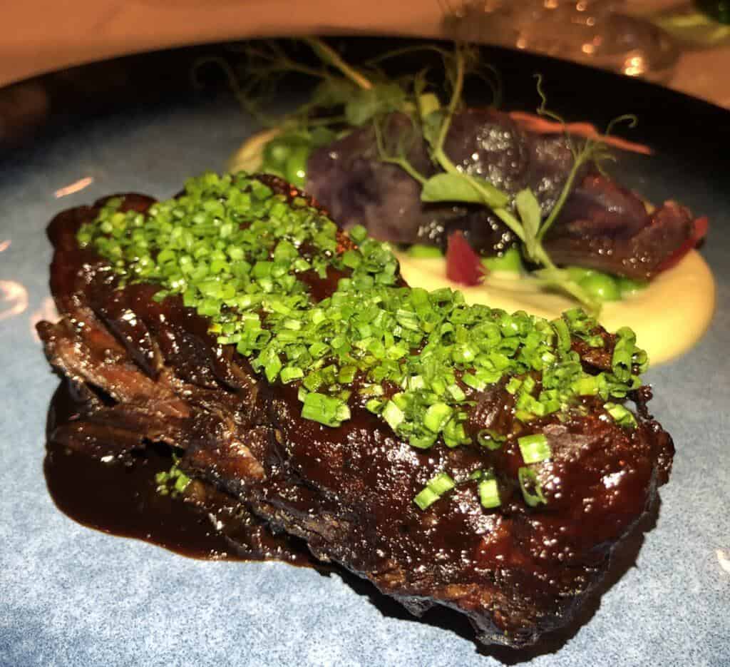 – Aeglaselt küpsetatud tallekael – Suitsuküüslaugu-pastinaagi püree, punane kapsas, mündised herned, mustajuure krõpsud, veinikaste