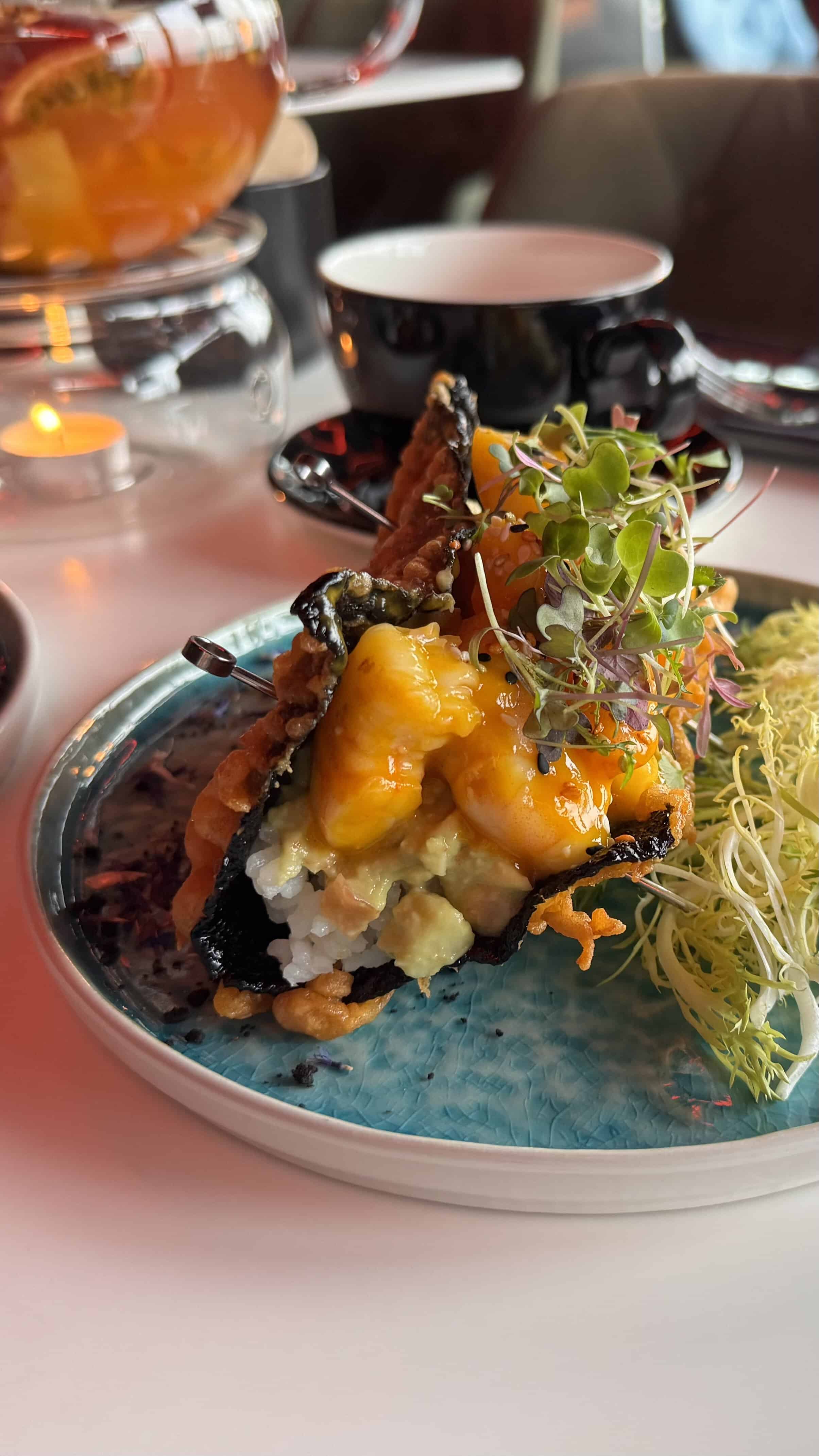 ✔ Tako nori krevettidega – krevetid olid mõnusalt krõmpsuvad, samas pehmed ja mahlased. Krõbe nori ja mango-pirnikaste andsid roale maitsva tasakaalu. Nori leht oli minu jaoks natuke raskesti käsitletav noa või näpu vahel süües, aga maitse meeldiv ja idee väga huvitav.