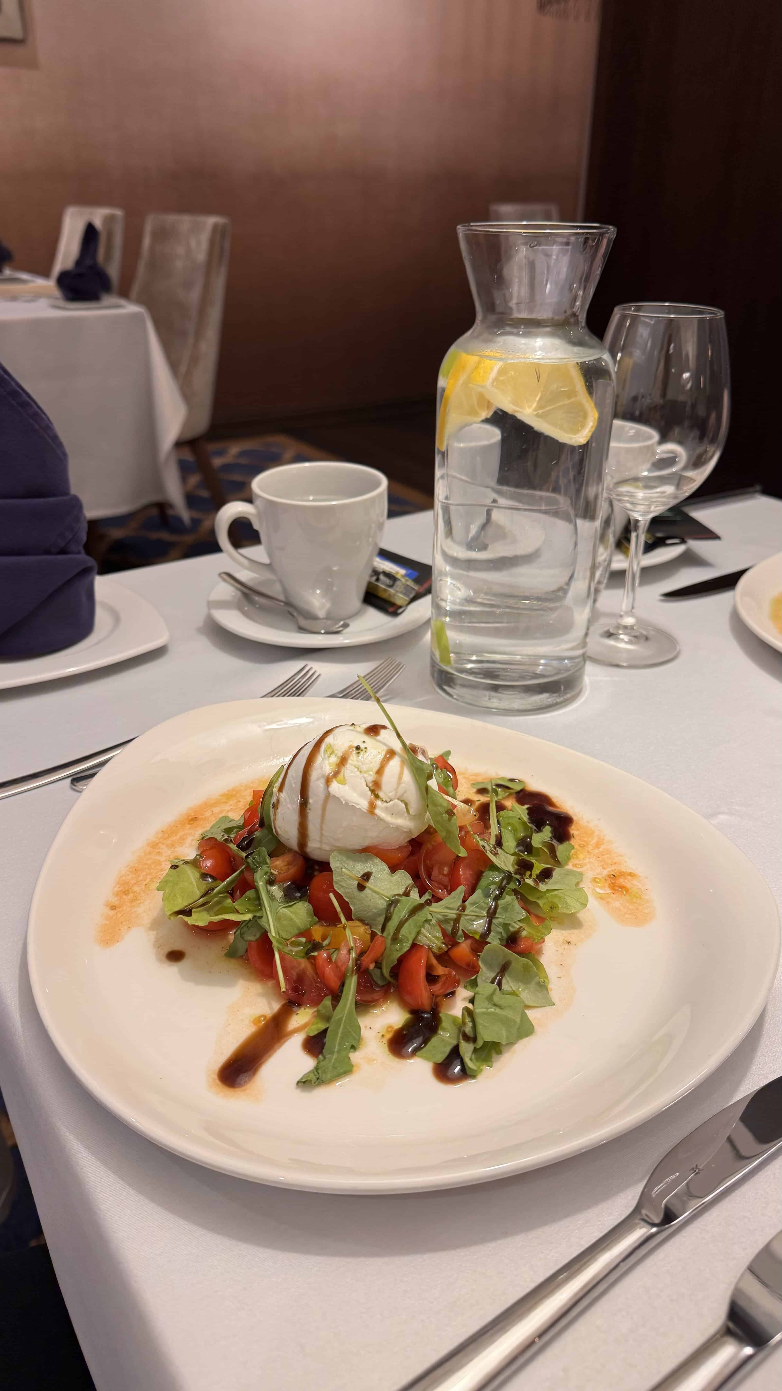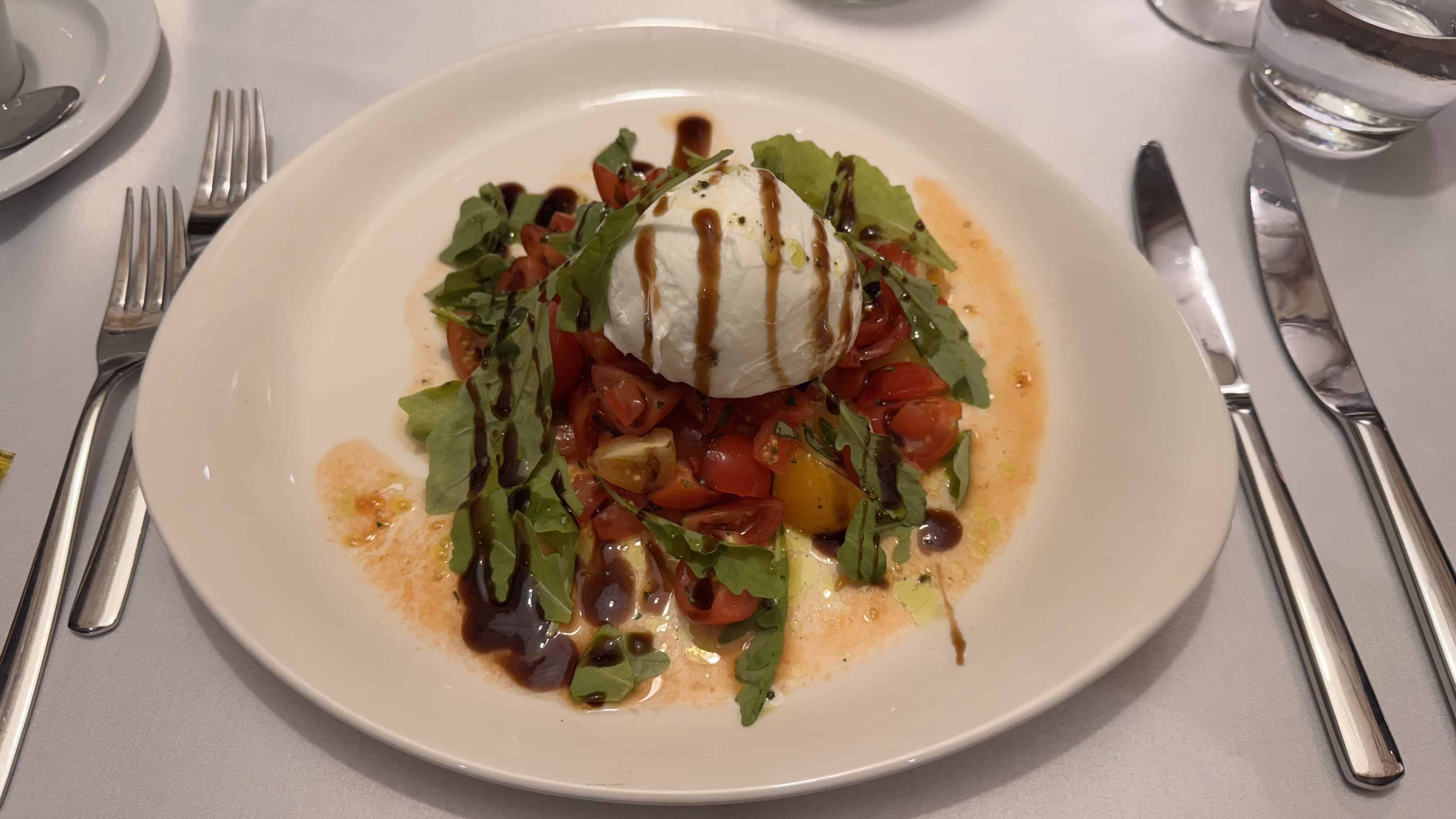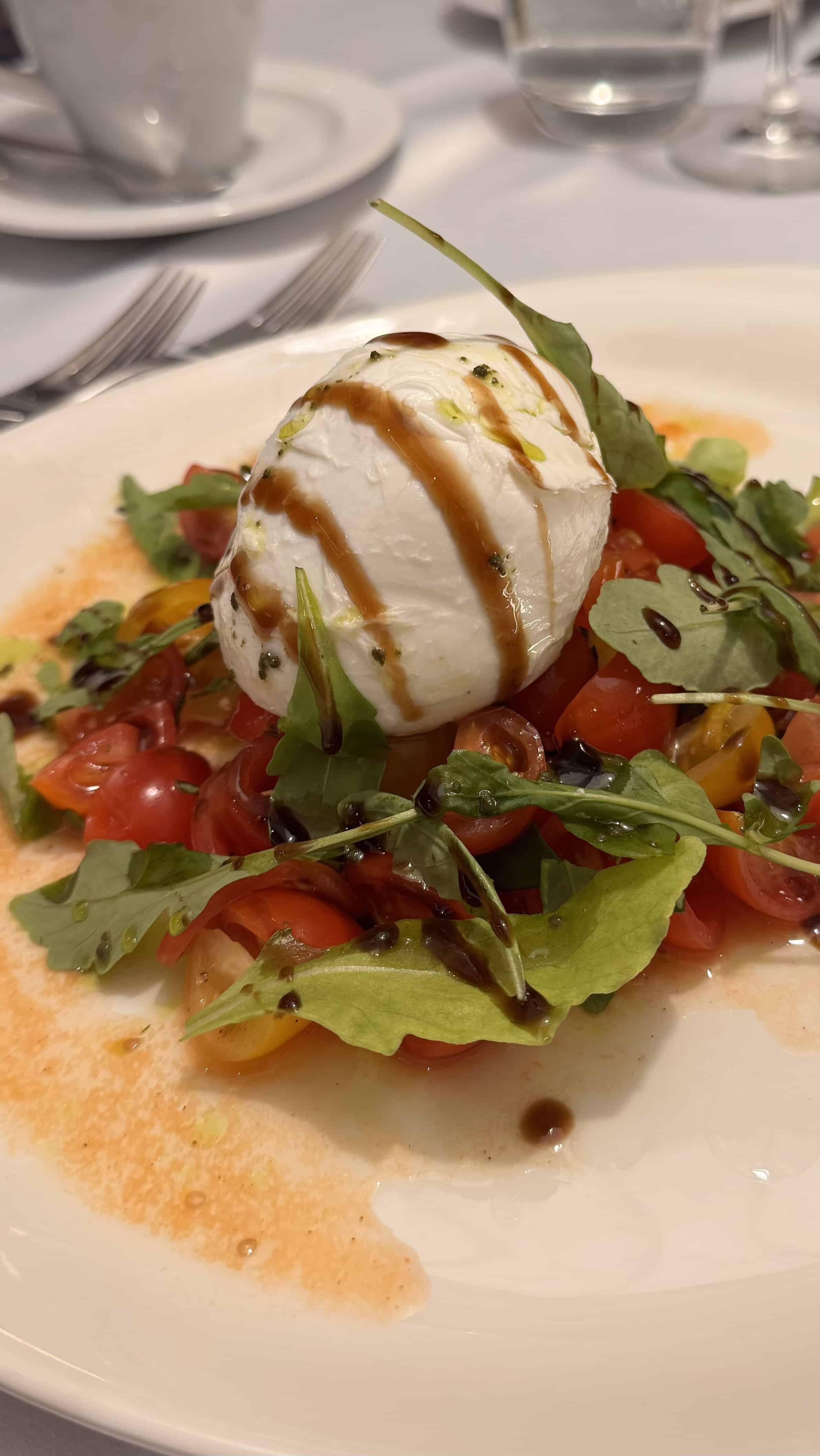 Yhtenä alkuruokana tarjotaan Mozzarella Caprese -salaattia. Herkullinen yhdistelmä – tomaatit ovat kotitekoisen makeita ja annoskoko erittäin suuri alkupalaksi.