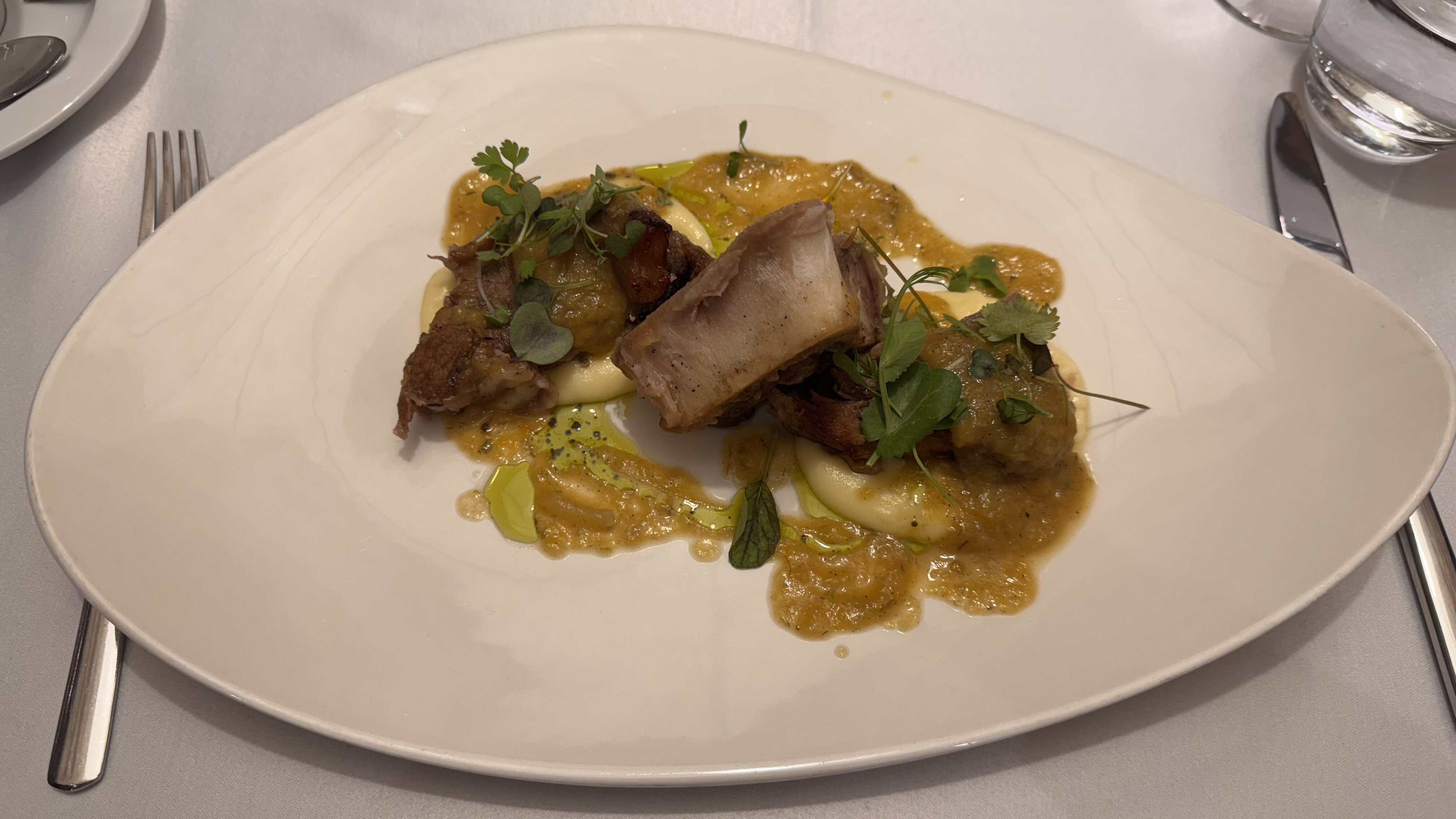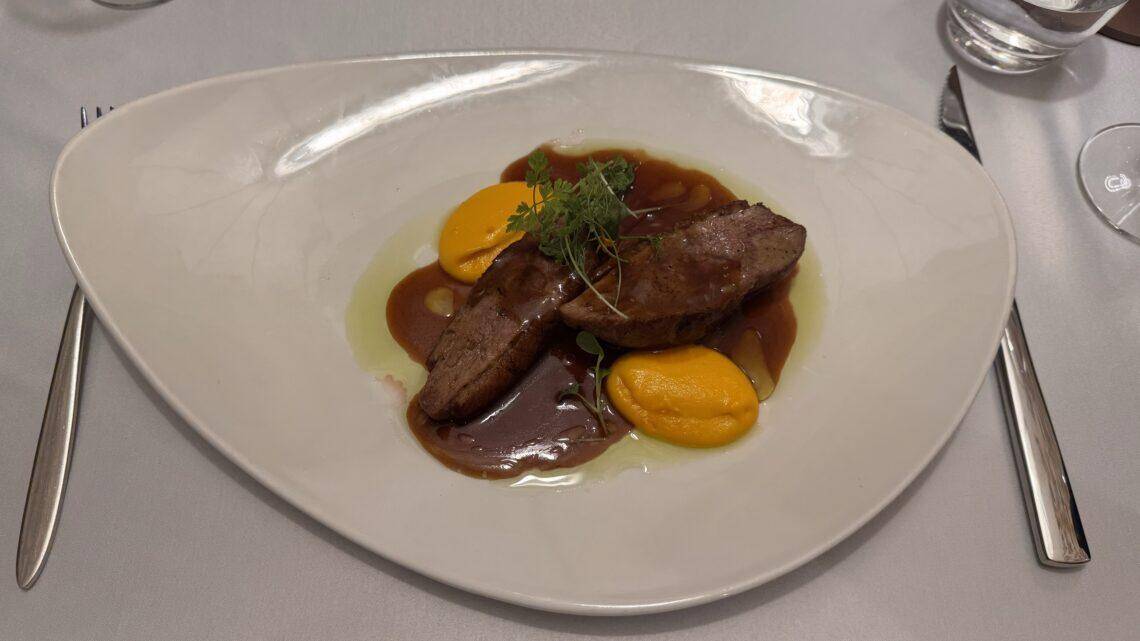 Yhtenä pääruokana he tarjoavat paahdettua ankankrintaa. Pyysimme sen medium plus -kypsyydellä, ja se oli hyvä valinta, sillä emme pidä liian raa’asta lihasta. Nahka olisi voinut olla vieläkin rapeampi, mutta liha itsessään oli pehmeää ja miellyttävän luonnollisen makuista. Lisukkeena ollut sose oli makeahko, mutta kokonaisuus toimi erittäin hyvin. Ehkä välillä olisi tehnyt mieli napata jokin kasvispala kylkeen, mutta huomasimme listalta, että sellainen mahdollisuus onkin erikseen saatavilla.