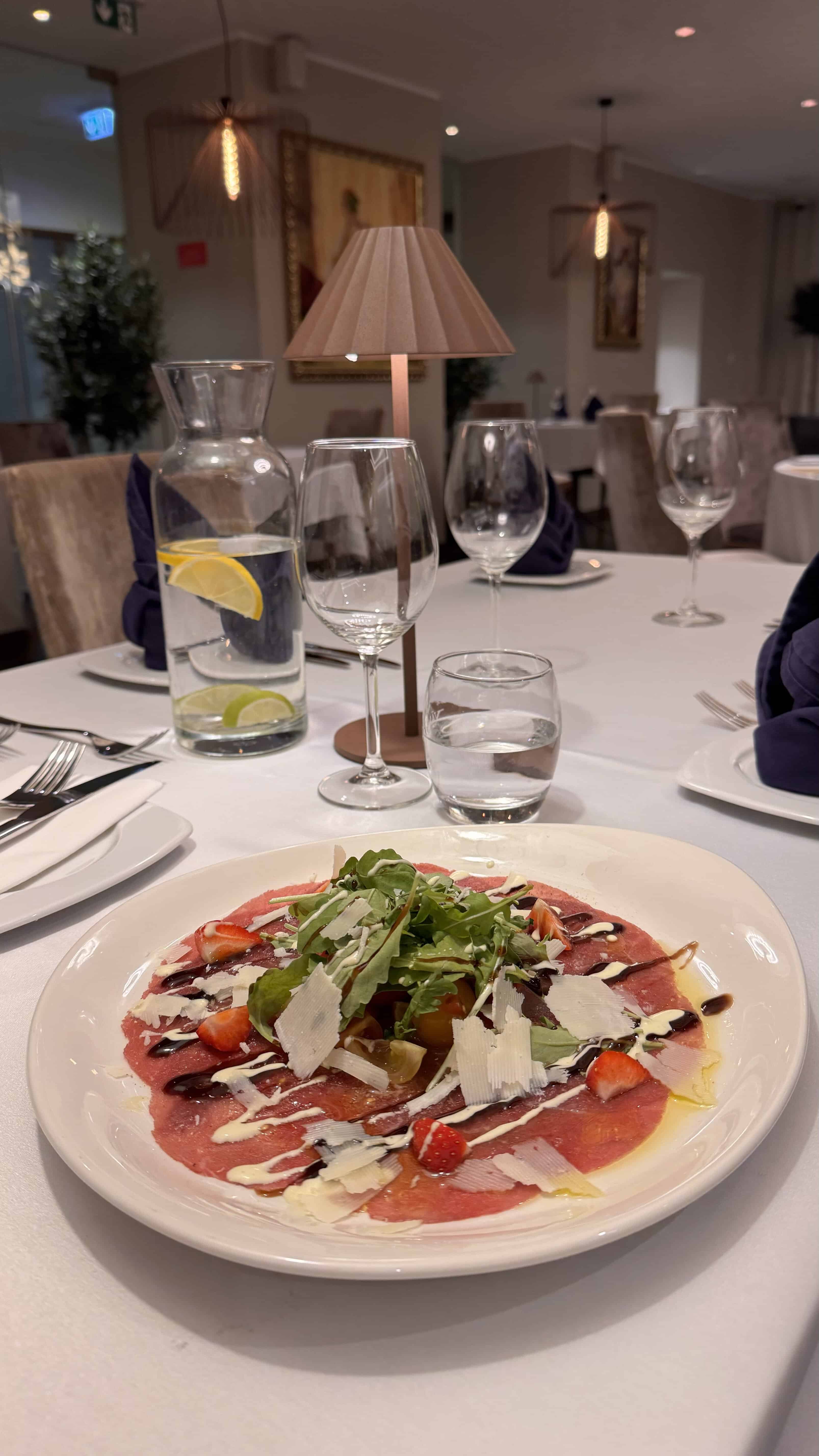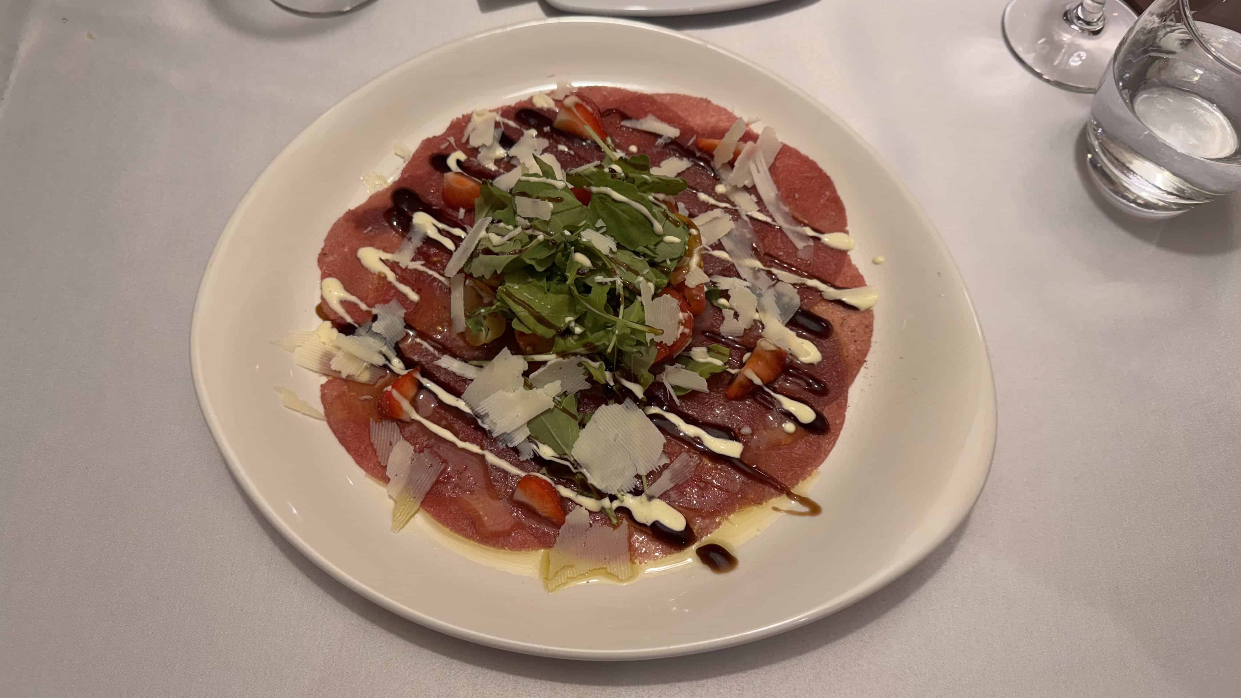 Toinen alkuruoka, jota maistoimme, oli naudan carpaccio. Suolainen juusto ja luonnollinen liha sointuivat maukkaasti yhteen.