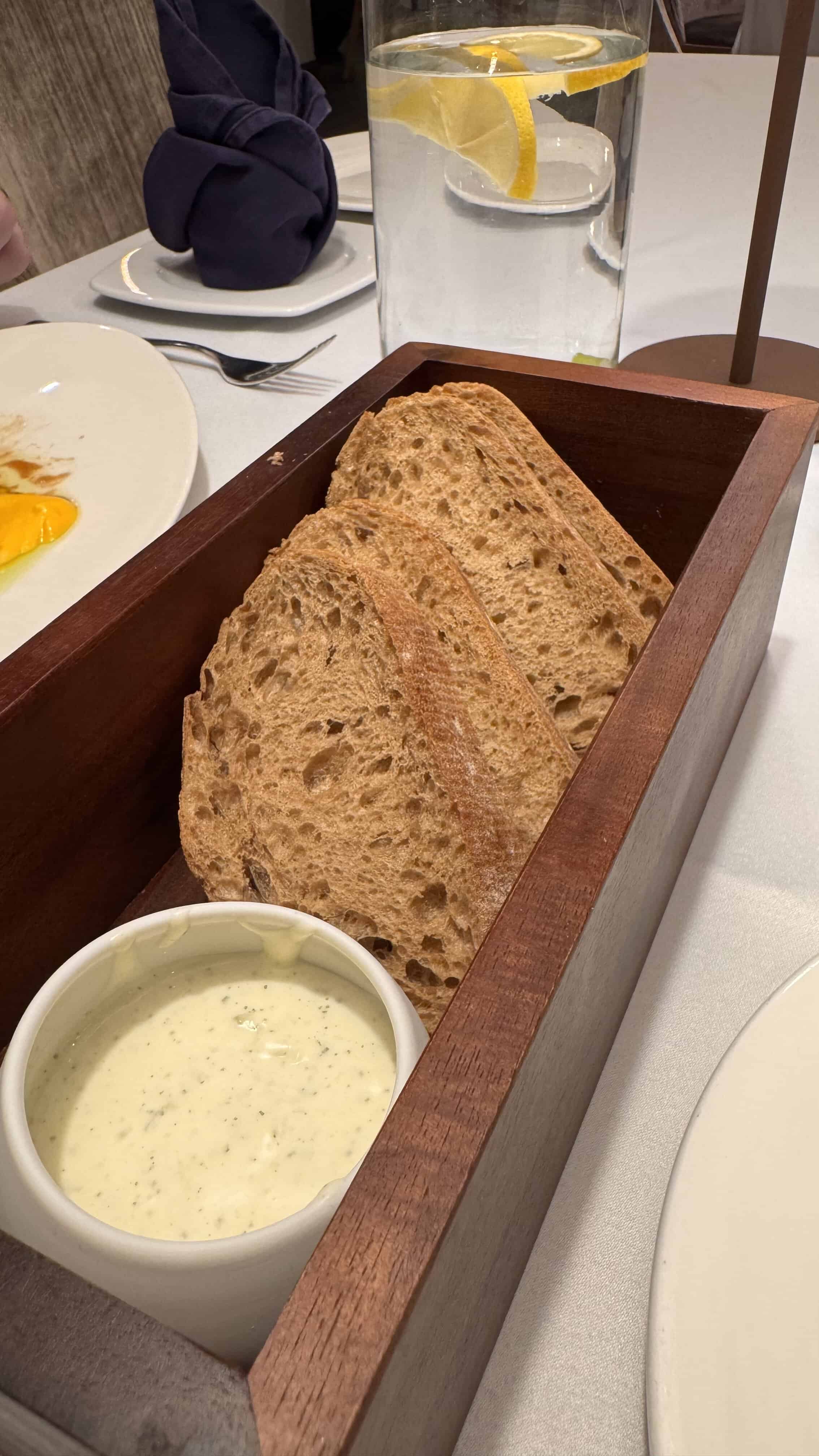 Joidenkin ruokien kanssa ei tarjoiltu ciabattaa voin kera, mutta pyysimme sitä silti erikseen, jotta saisimme maistaa, kuinka hyvää itse tehty ciabatta on. Leipä oli täydellinen – päältä rapea ja sisältä pehmeä. Voi sen kanssa oli erilainen kuin odotin – koostumukseltaan juoksevampi, melkein kuin kylmä kastike, mutta leivän päälle levitettynä toimi mainiosti.
