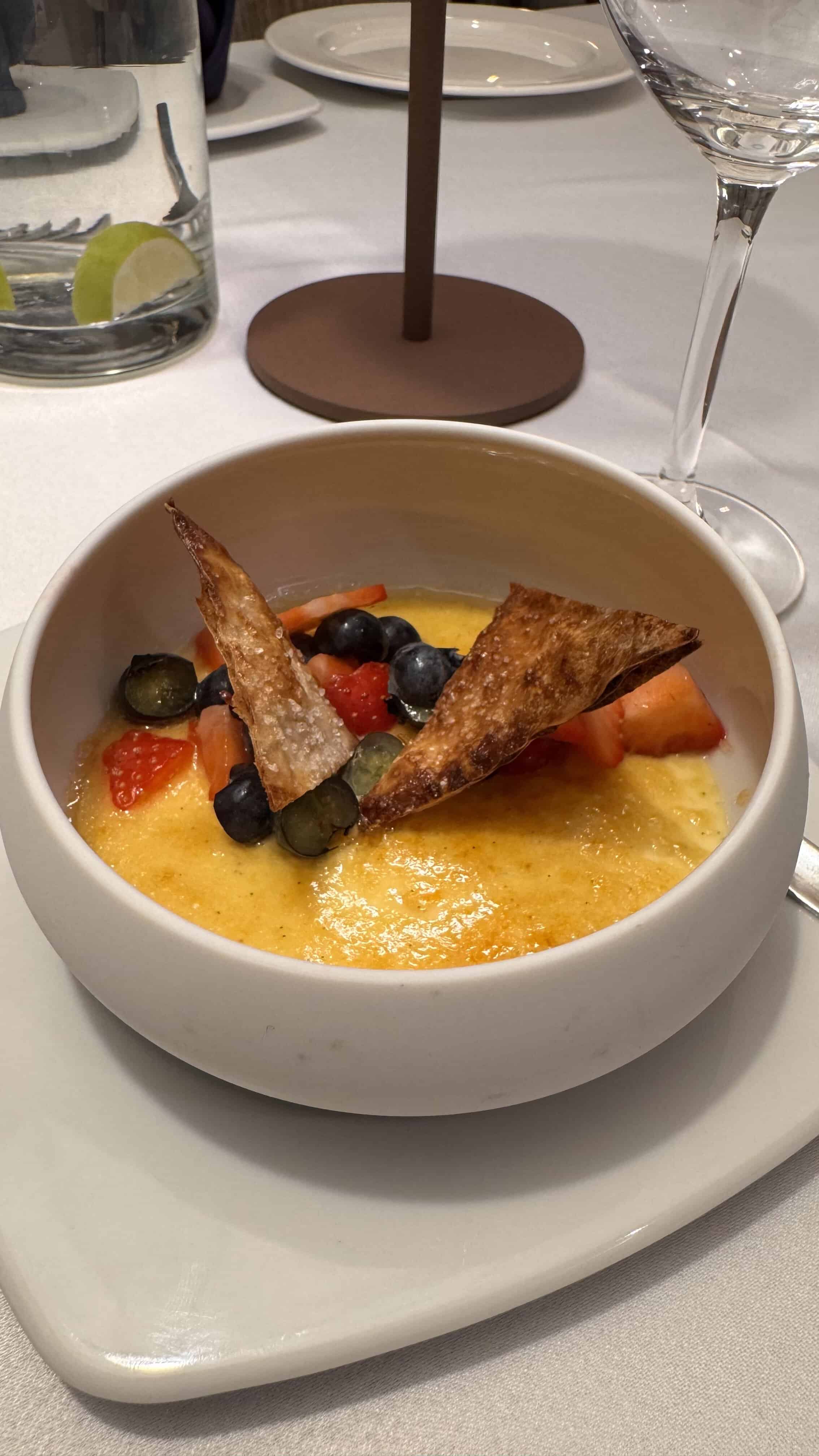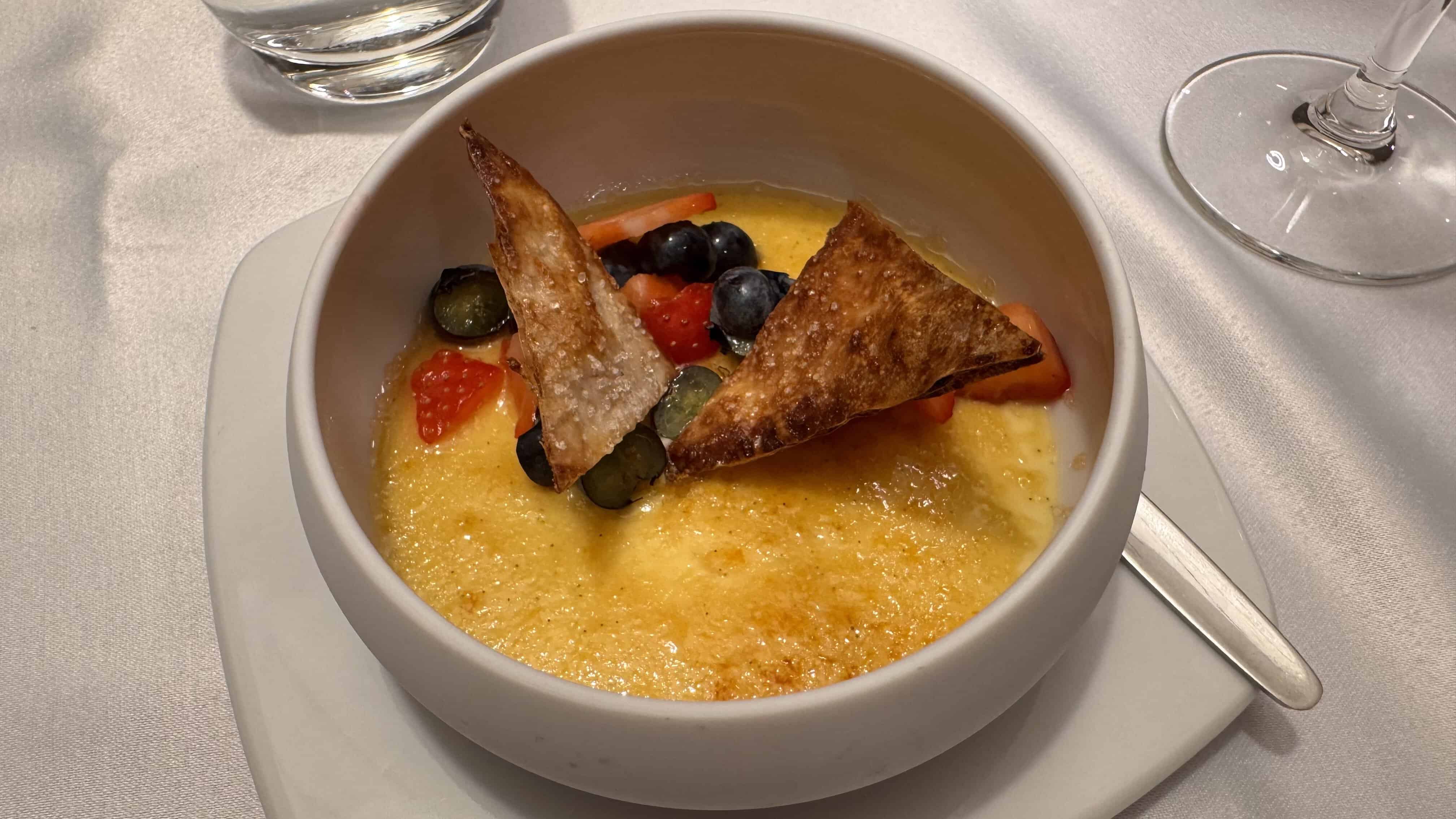 Jälkiruoaksi maistoimme molemmat tarjolla olleet vaihtoehdot. Crème brûlée makean, rapean keksin kera oli todella erityinen – koostumus samettinen ja kokonaisuus klassisen herkullinen.