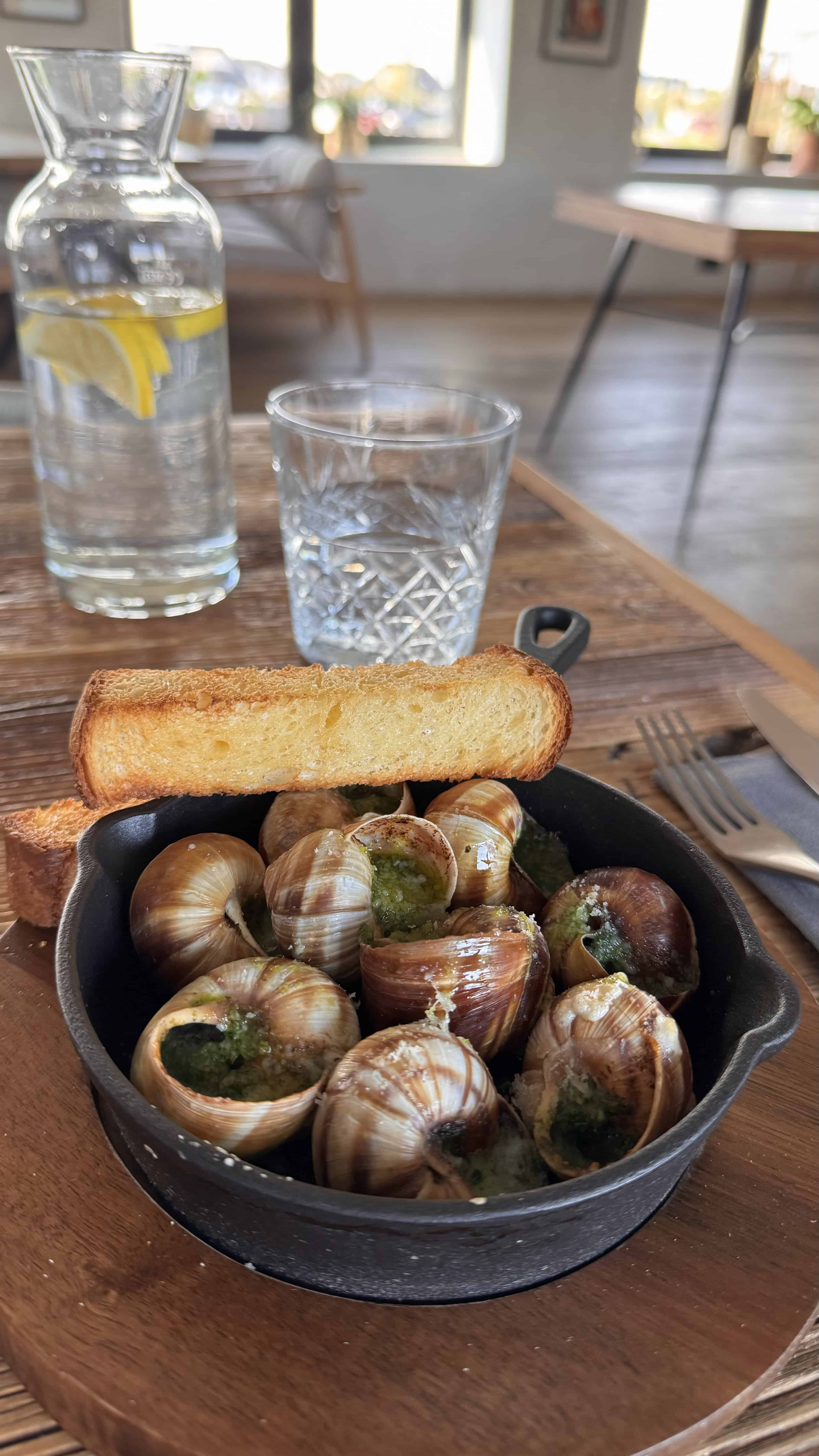 Maistoin molemmat alkuruoat. Ensimmäisenä pöytään tuotiin etanat. Ne olivat upeita – suolaisia ja meheviä valkosipuli-yrttivoissa. Oli myös hauskaa napata ne pienestä kuoresta erityisellä haarukalla 😜.