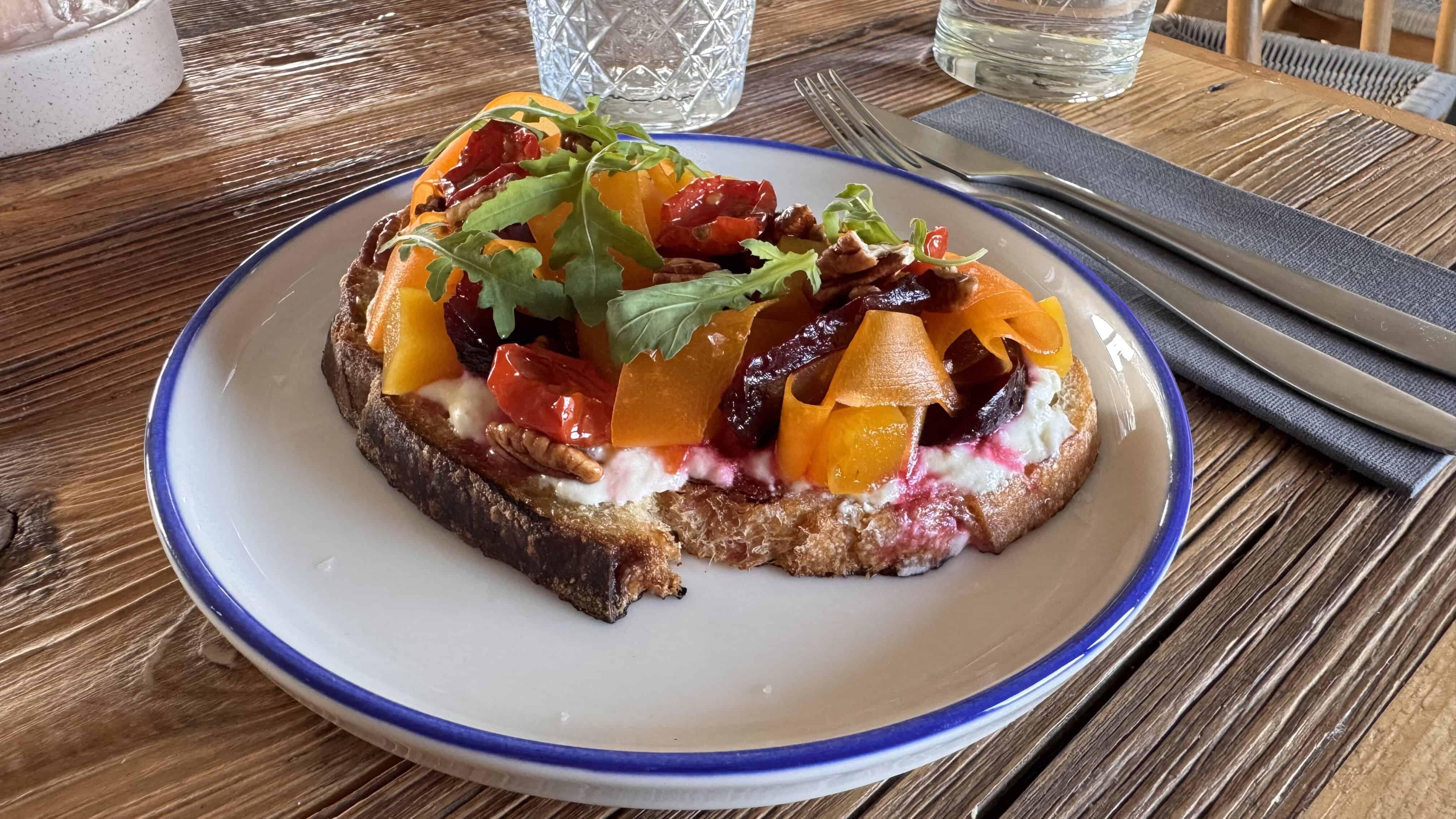 1. Bruschetta – Hapanleivällä fetavaahto, fermentoitu kurpitsa, uunijuuri ja saksanpähkinä
