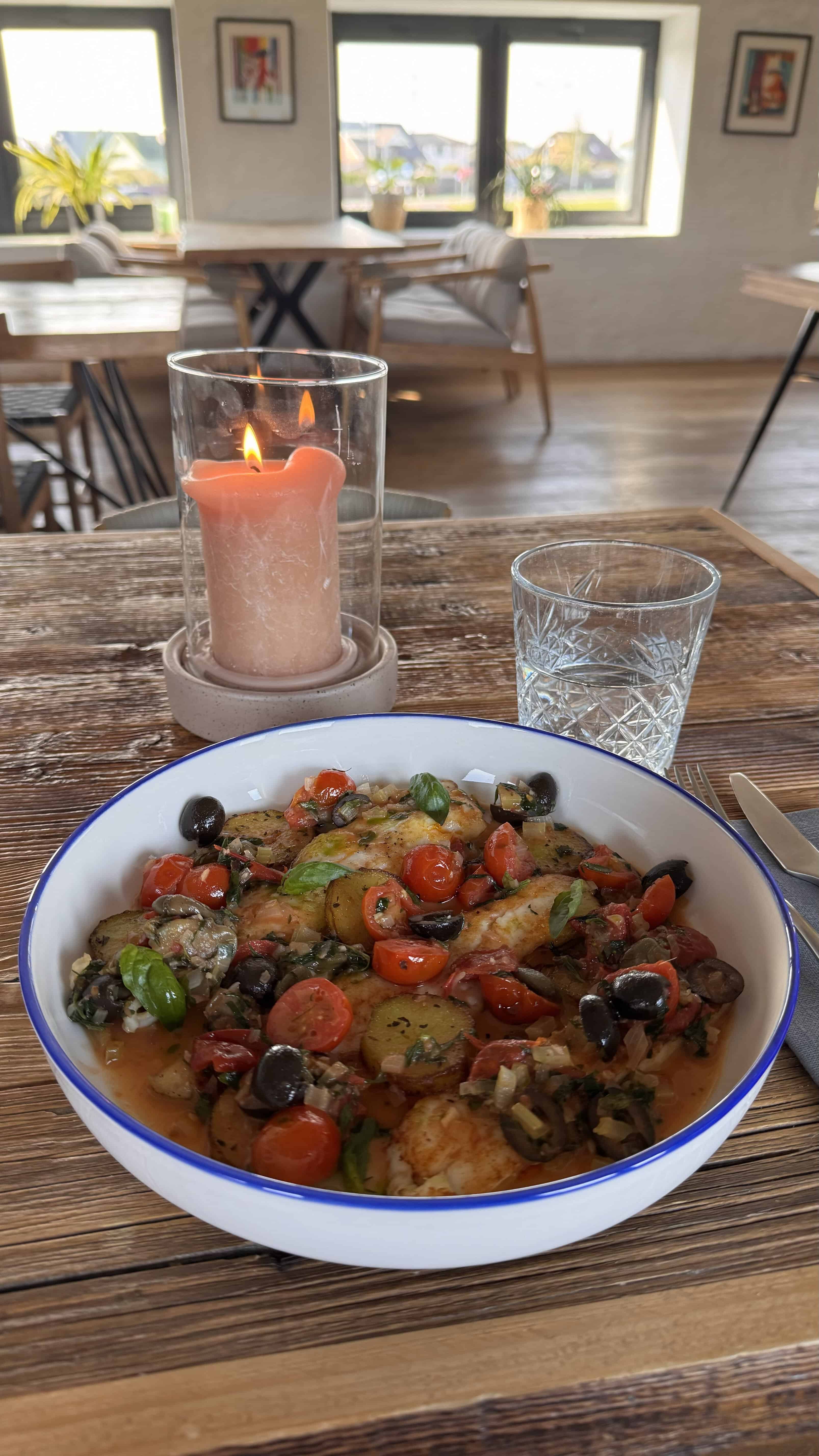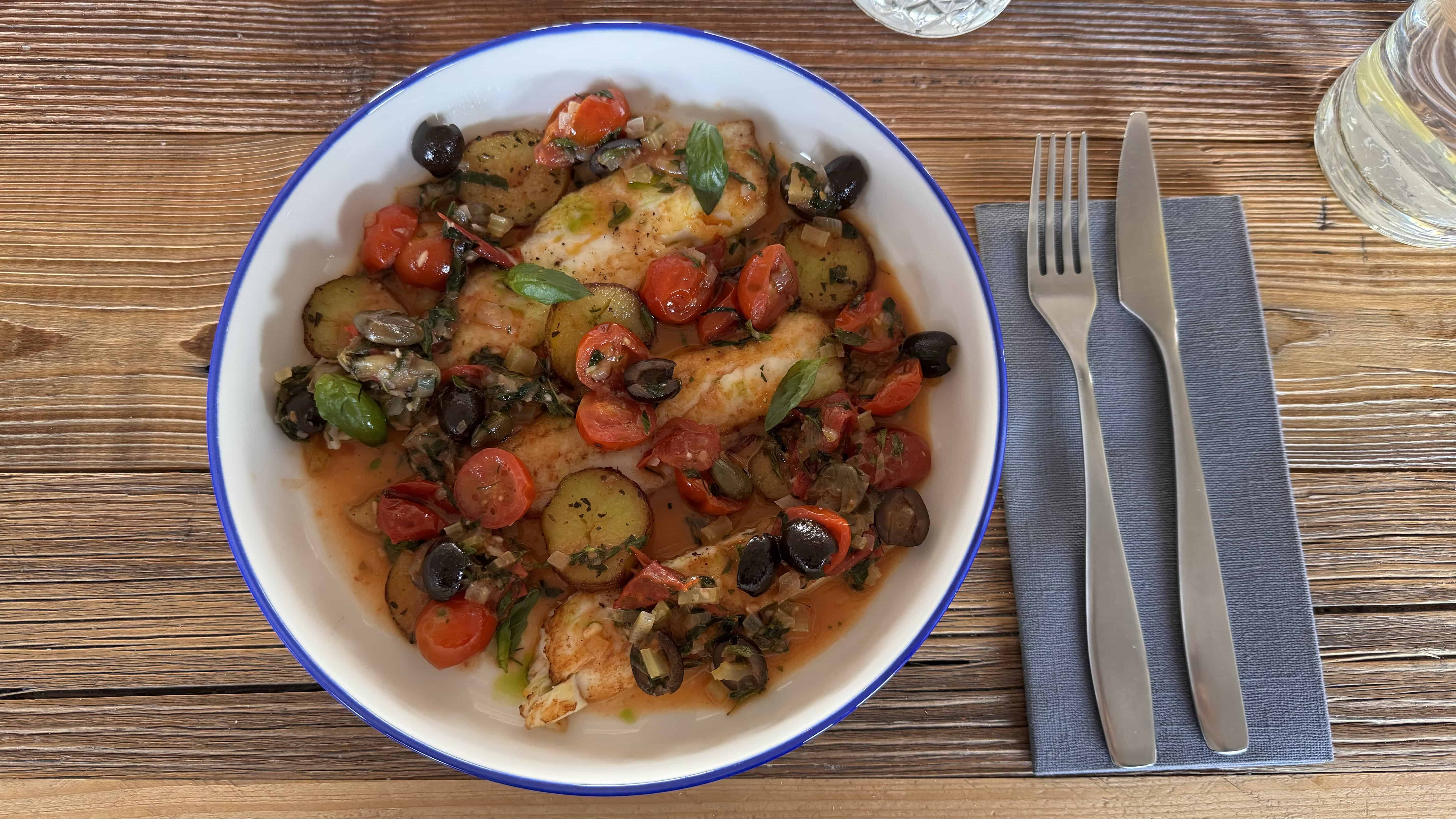 Pääruoaksi valitsin merianturan – melko tulinen ja mausteinen annos, jossa maistuu monipuolisesti Välimeren mausteet. Paljon kapriksia ja oliiveja – jos pidät voimakkaista mauista, suosittelen tätä lämpimästi! Lisätietona: merianturan liha on mietoa, hieman makeaa ja pehmeän voimaista.