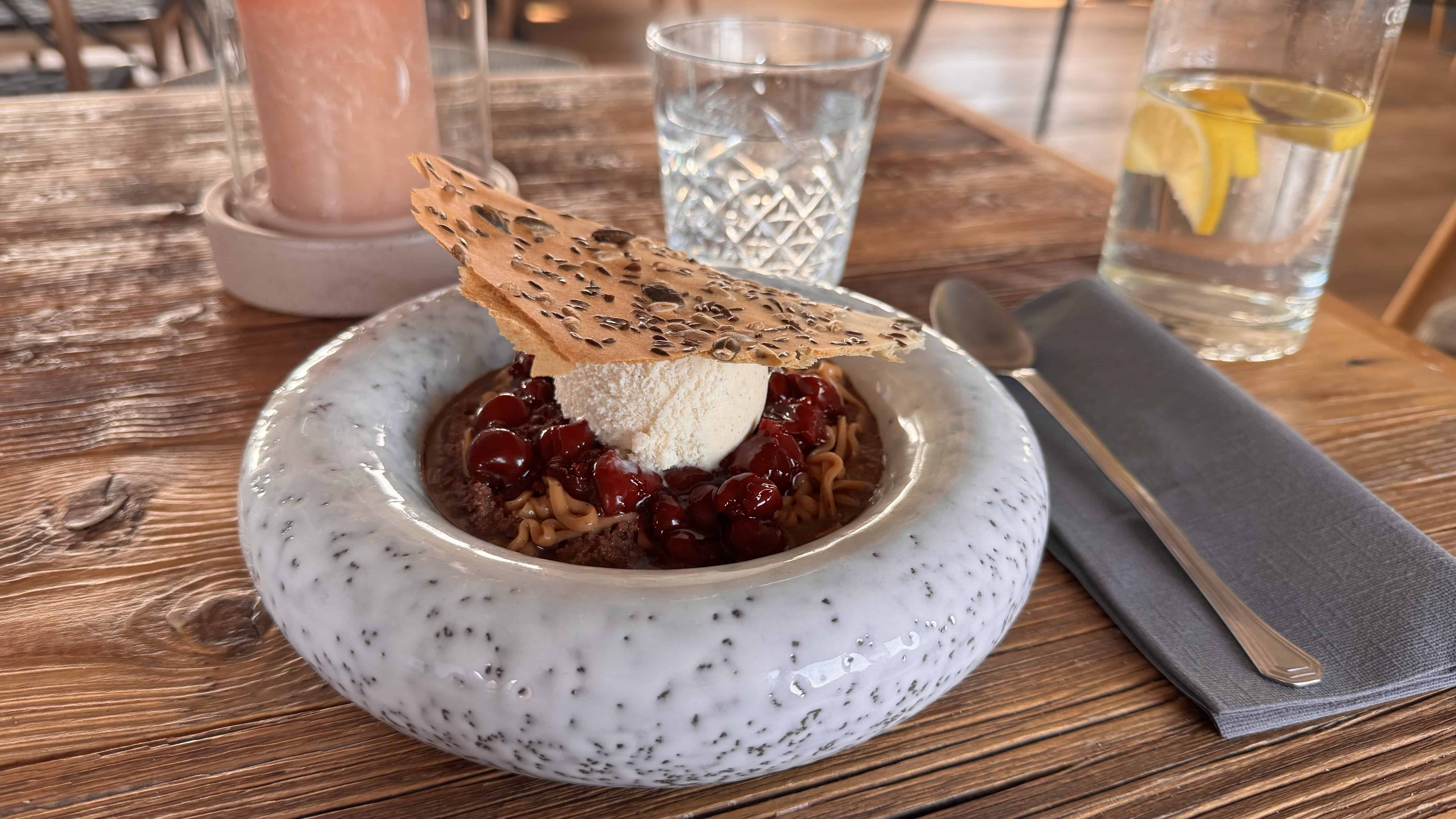 Lopuksi tarjolla oli suklaamousse – ihanan suklainen ja kirsihillo sopi siihen täydellisesti. Kuohkea mousse ja vaniljajäätelö olivat aivan eri tasolla verrattuna kaupan versioihin 😋.