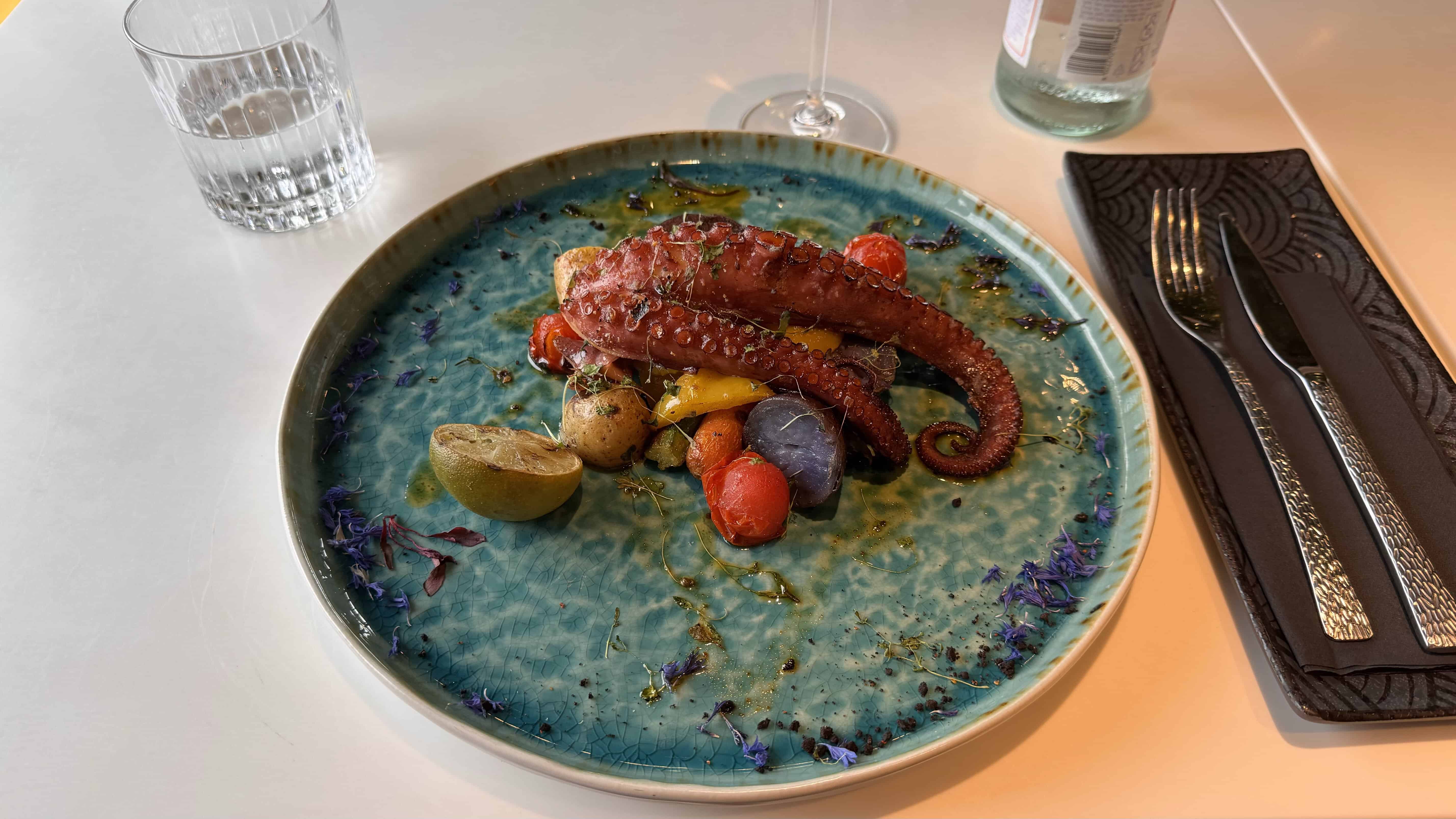 В качестве основного блюда подают осьминога – разнообразные специи создают особую, многогранную вкусовую палитру. Мясо не резиновое, а наоборот — мягкое и идеально приготовленное. Порция действительно большая, подаётся на ещё более массивной тарелке 🙂